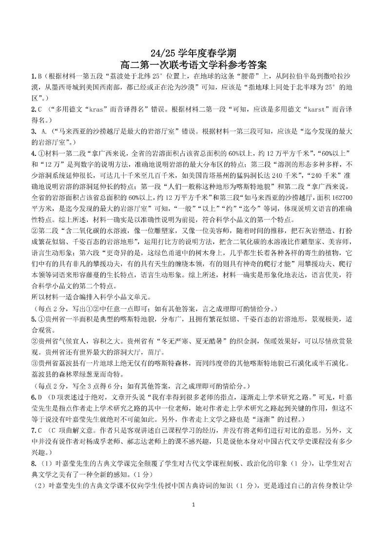 江苏省盐城市五校2024-2025学年下学期3月高二第一次联考语文答案