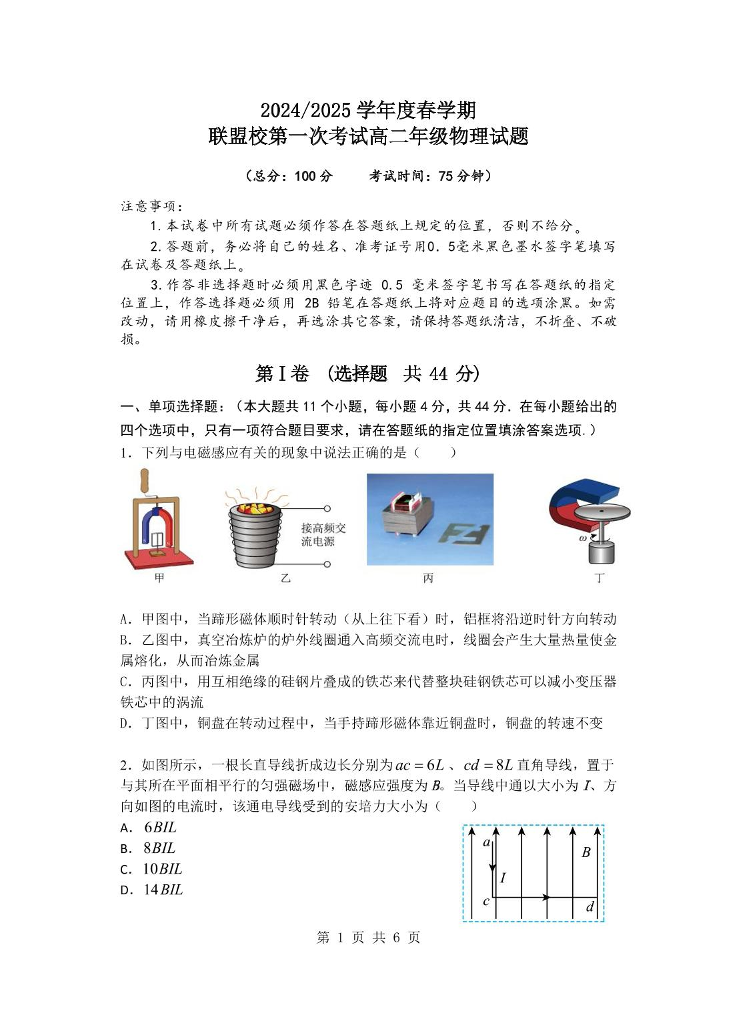 江苏省盐城市五校2024-2025学年下学期3月高二第一次联考物理