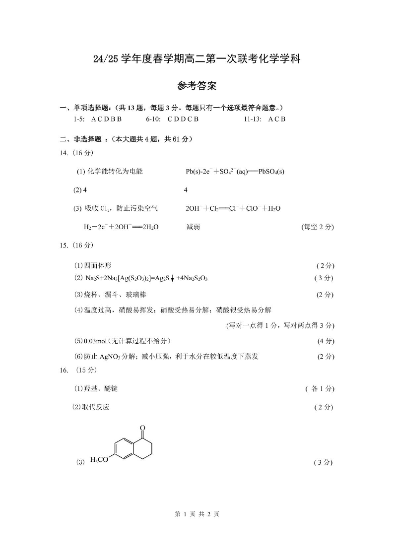 江苏省盐城市五校2024-2025学年下学期3月高二第一次联考化学答案