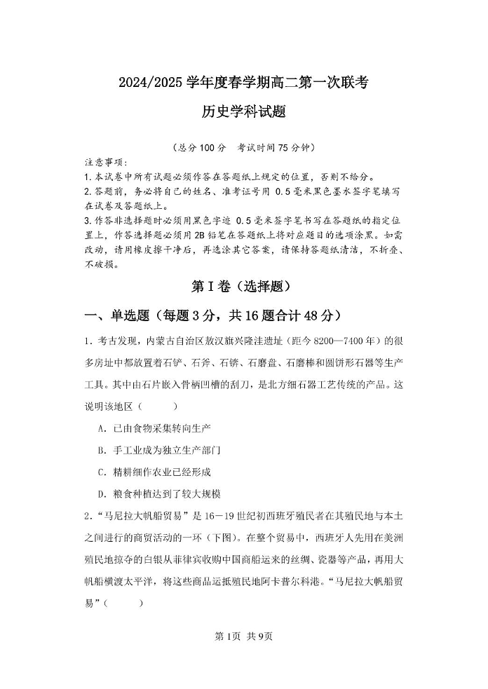 江苏省盐城市五校2024-2025学年下学期3月高二第一次联考历史