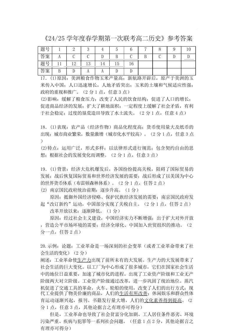 江苏省盐城市五校2024-2025学年下学期3月高二第一次联考历史答案