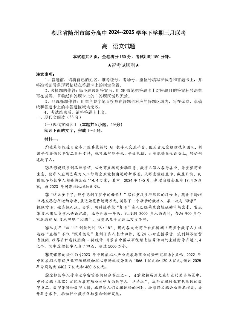 湖北省随州市部分高中2024-2025学年下学期3月高一联考语文