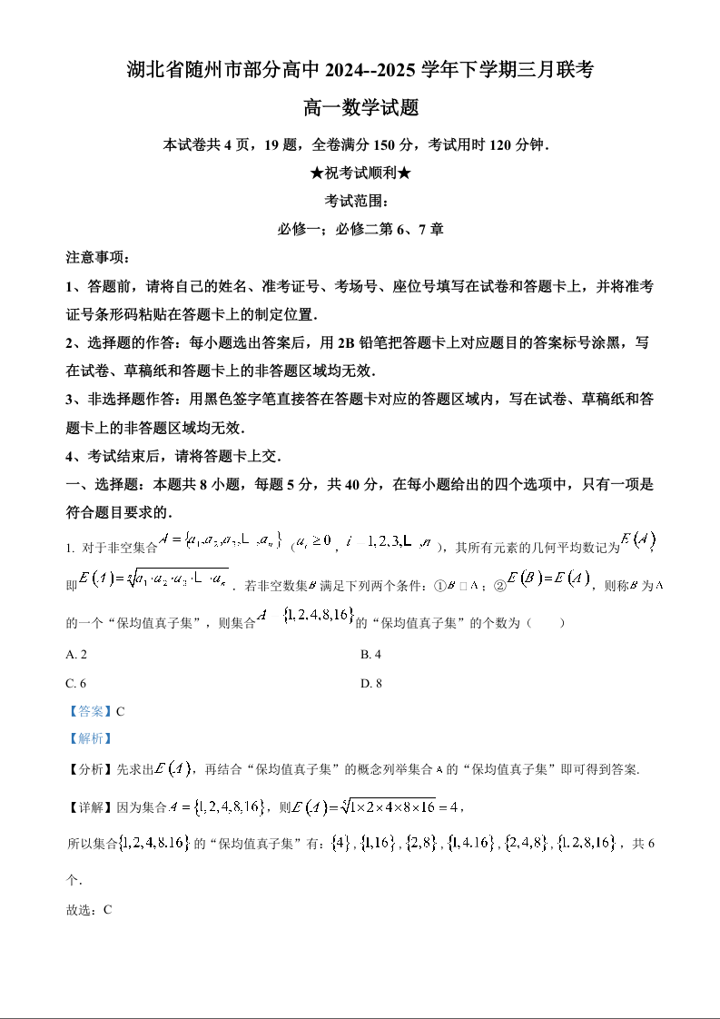 湖北省随州市部分高中2024-2025学年下学期3月高一联考数学(解析版)