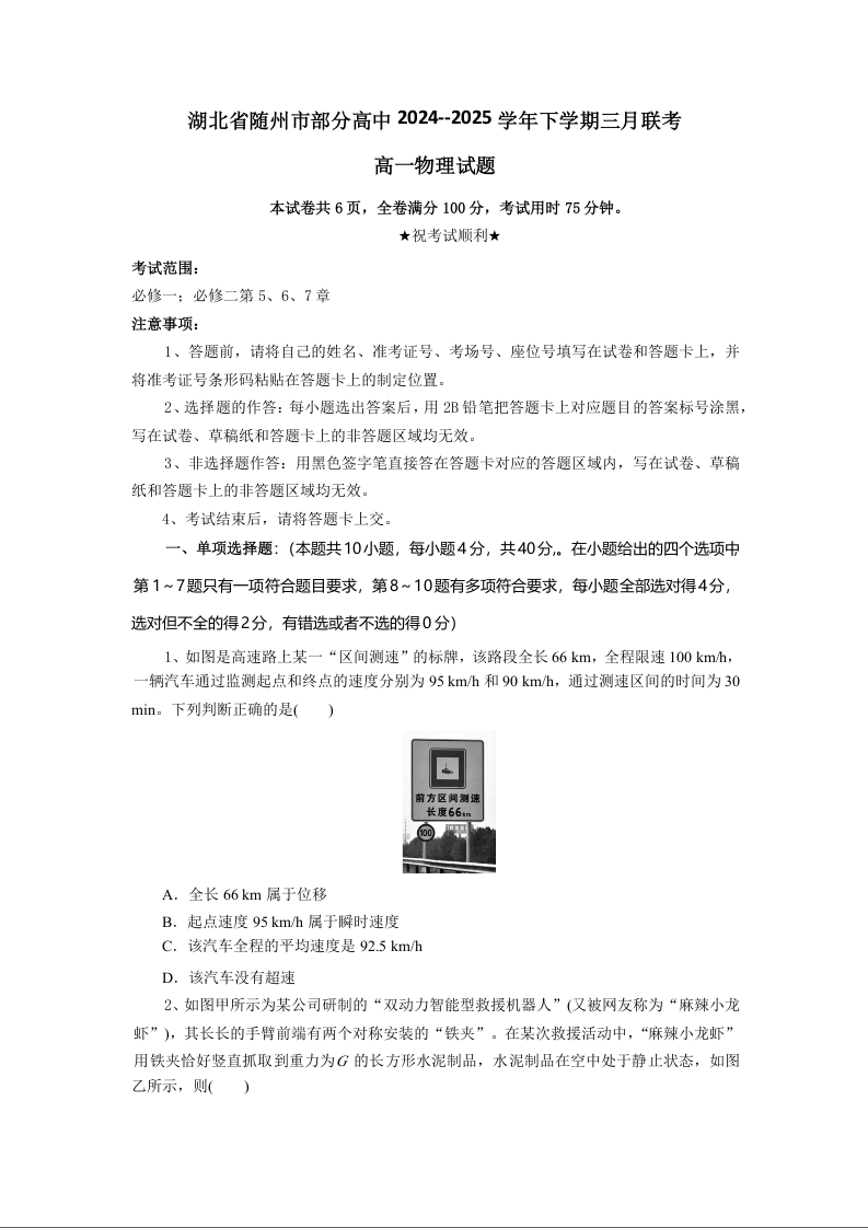 湖北省随州市部分高中2024-2025学年下学期3月高一联考物理