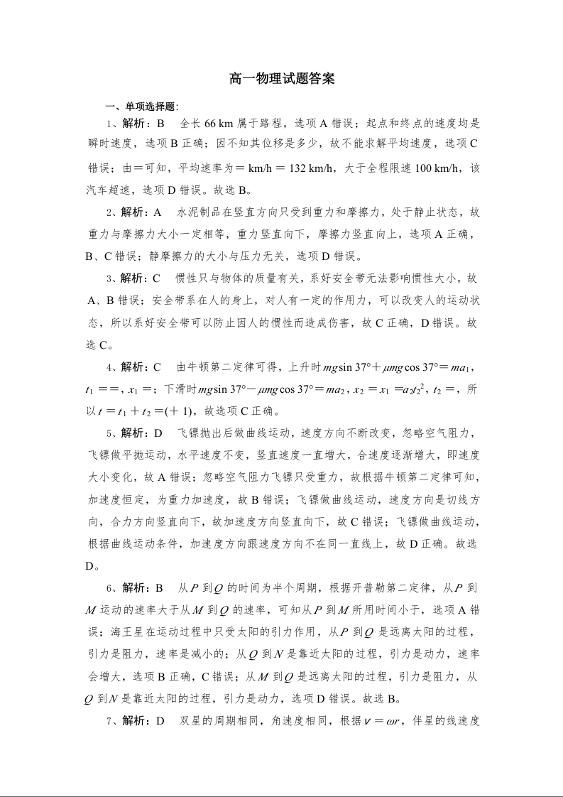 湖北省随州市部分高中2024-2025学年下学期3月高一联考物理答案