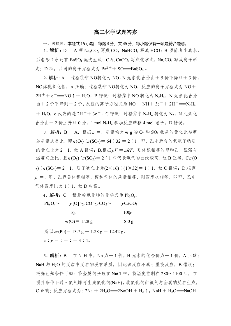 湖北省随州市部分高中2024-2025学年下学期3月高一联考化学答案