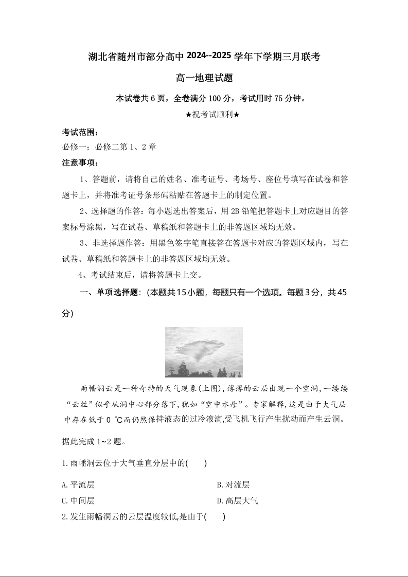 湖北省随州市部分高中2024-2025学年下学期3月高一联考地理