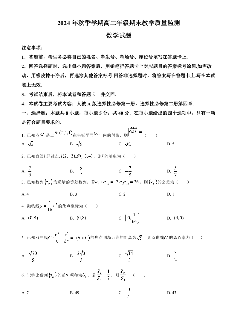 广西壮族自治区崇左市2024-2025学年上学期1月高二期末考试数学(原卷版)