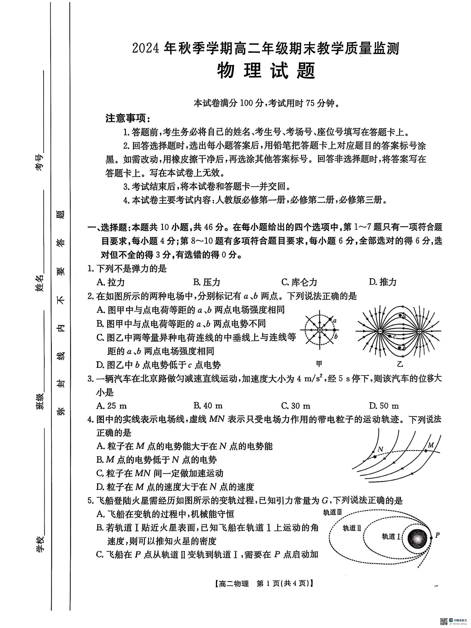 广西壮族自治区崇左市2024-2025学年上学期1月高二期末考试物理