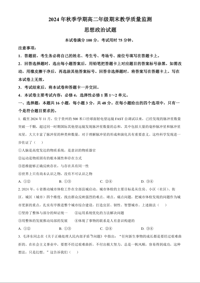 广西壮族自治区崇左市2024-2025学年上学期1月高二期末考试政治(原卷版)