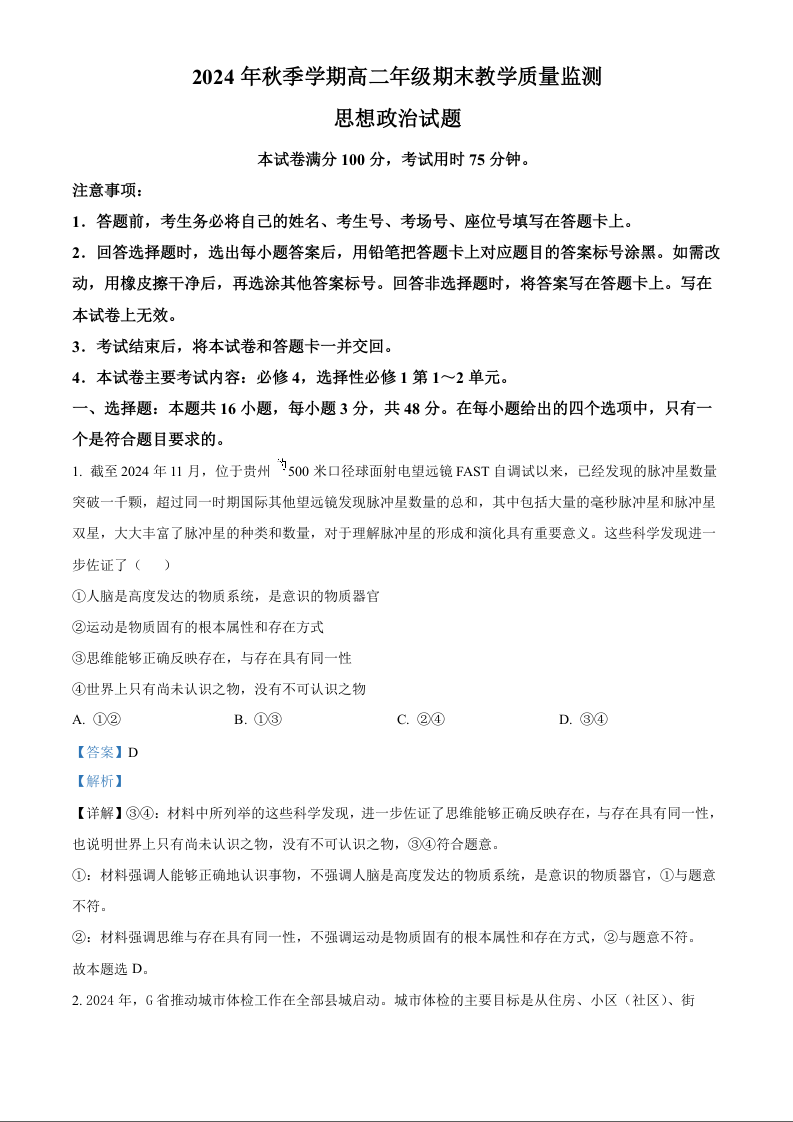 广西壮族自治区崇左市2024-2025学年上学期1月高二期末考试政治(解析版)