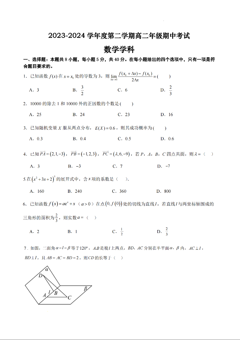 江苏省南通市海安高级中学2023-2024学年高二下学期期中考试数学