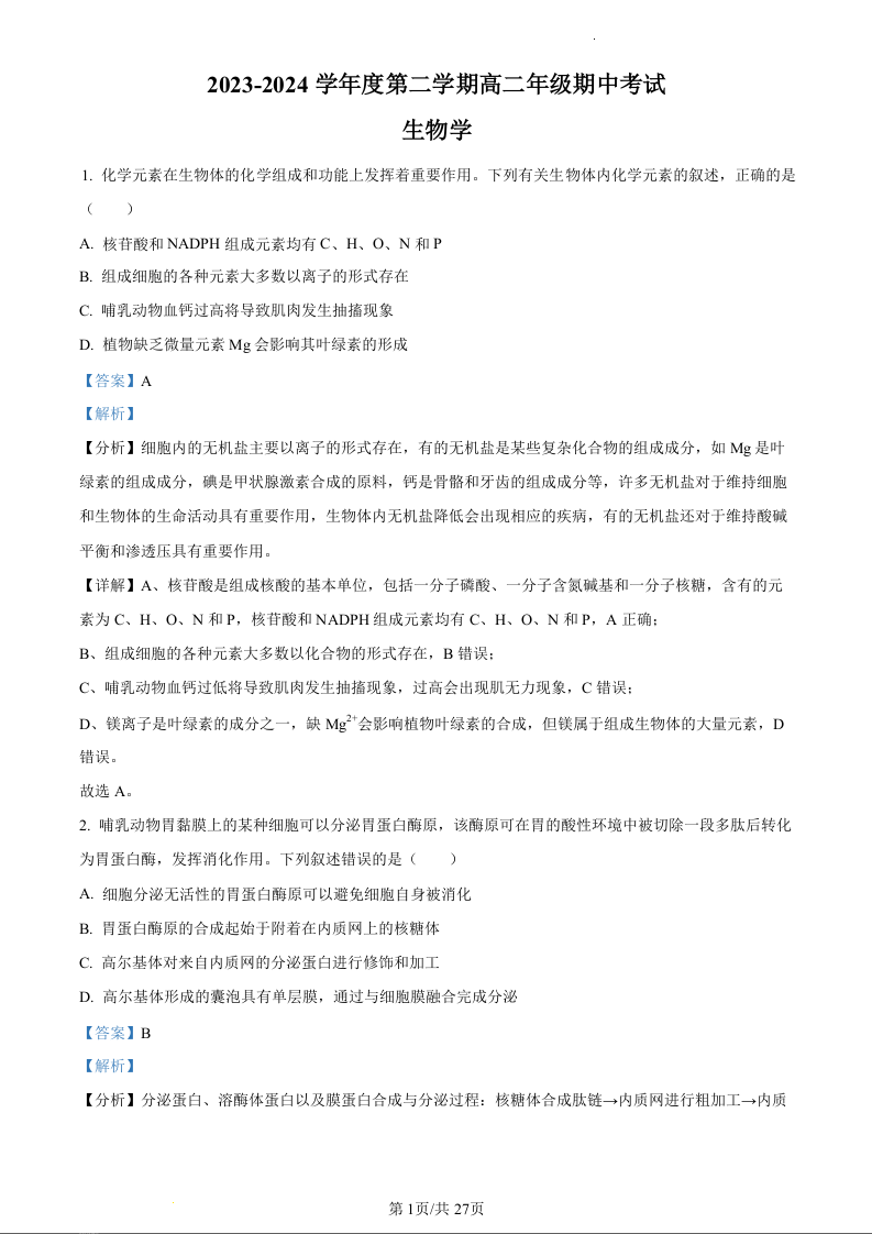 江苏省南通市海安高级中学2023-2024学年高二下学期期中考试生物(精品解析版)