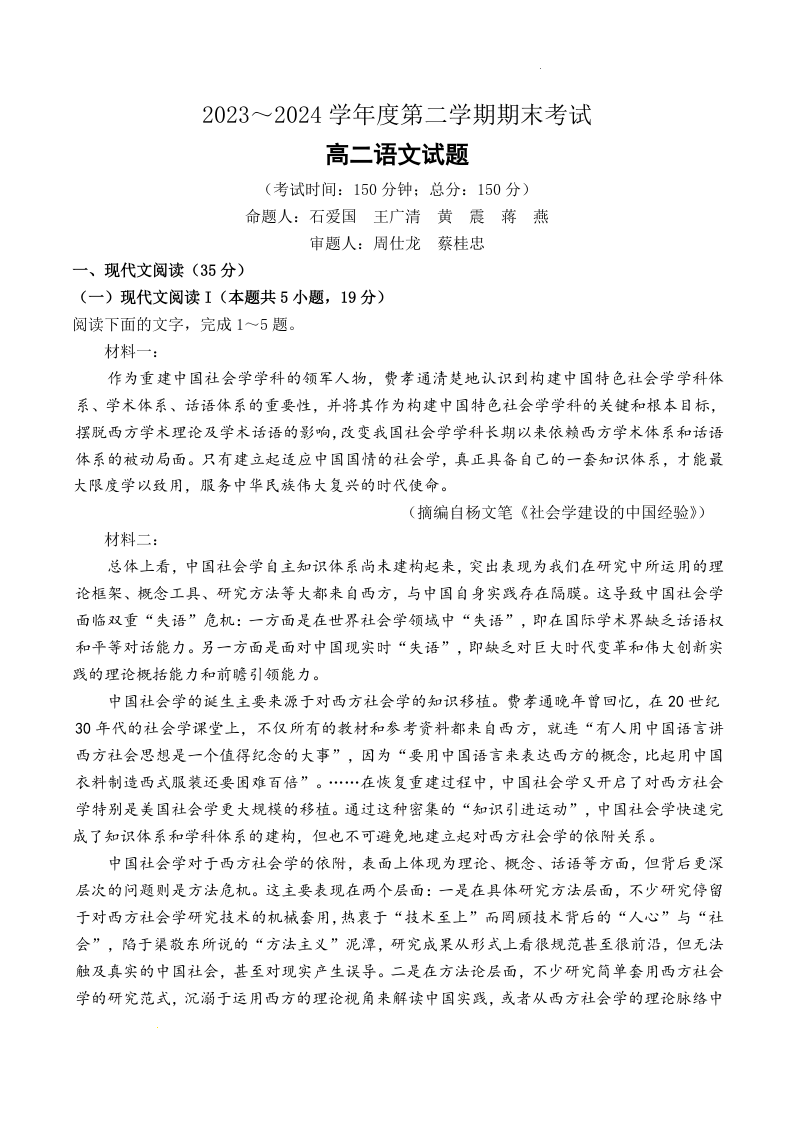 江苏省泰州市2023-2024学年高二下学期6月期末考试语文