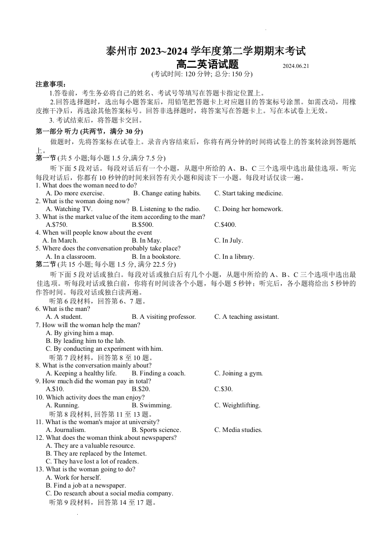 江苏省泰州市2023-2024学年高二下学期6月期末考试英语+答案