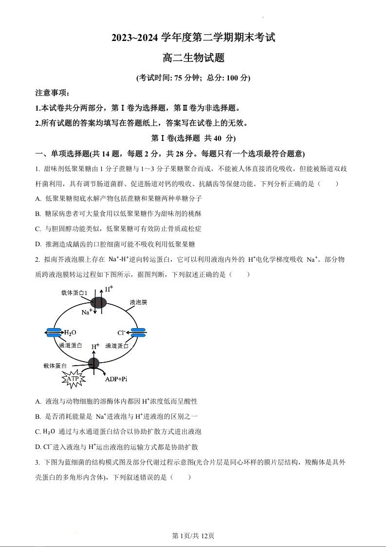 江苏省泰州市2023-2024学年高二下学期6月期末考试生物(原卷版)