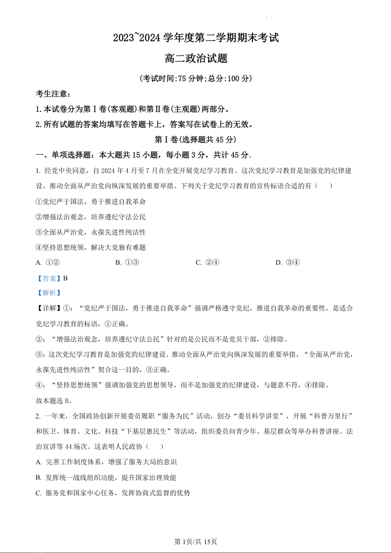 江苏省泰州市2023-2024学年高二下学期6月期末考试政治(精品解析版)