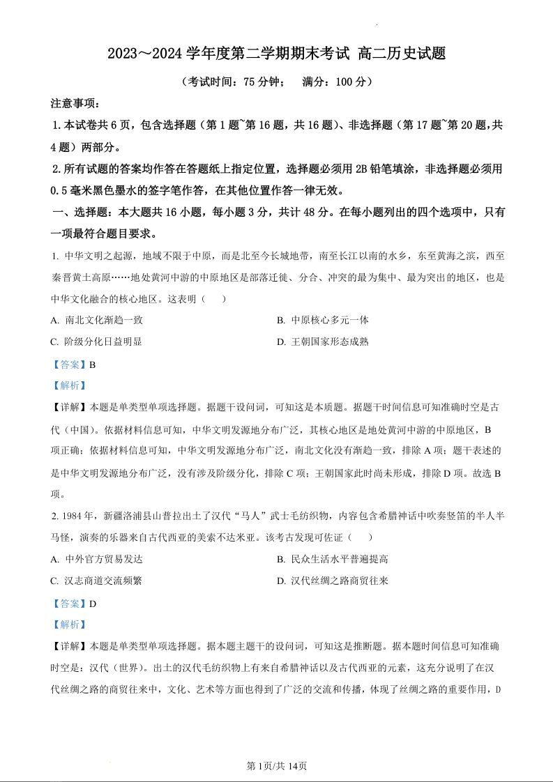 江苏省泰州市2023-2024学年高二下学期6月期末考试历史(精品解析版)