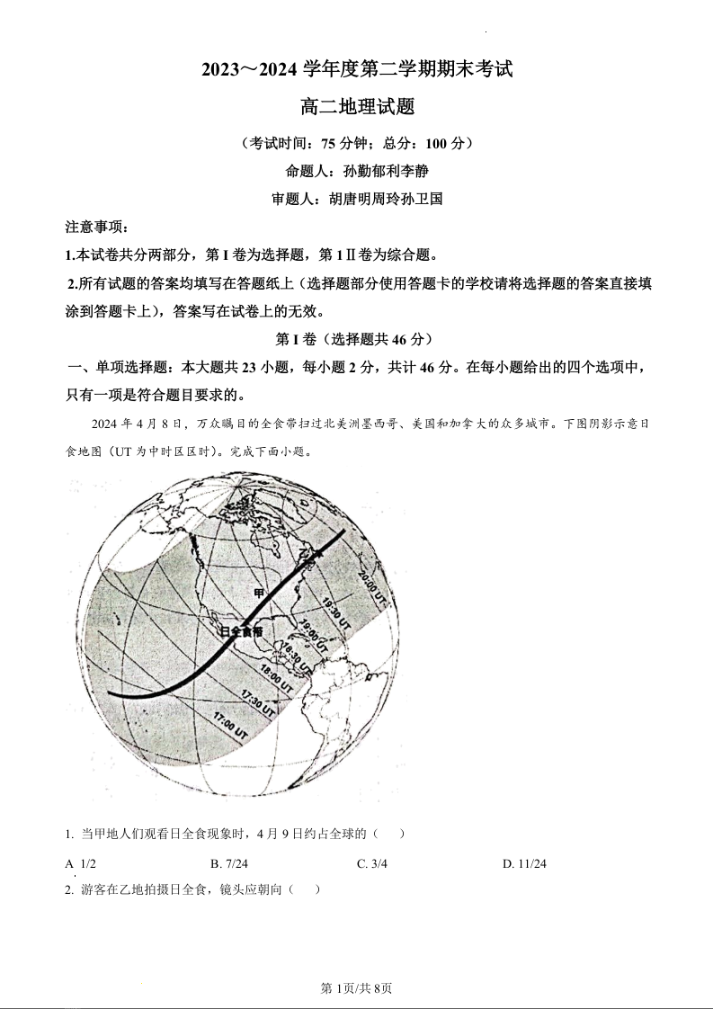 江苏省泰州市2023-2024学年高二下学期6月期末考试地理(原卷版)