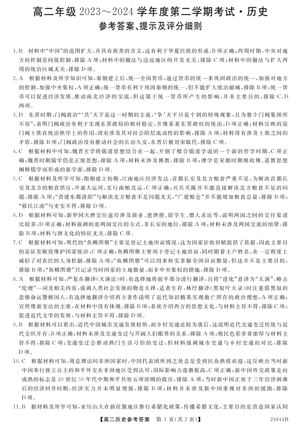 江苏省盐城市2023-2024学年高二下学期5月月考历史答案