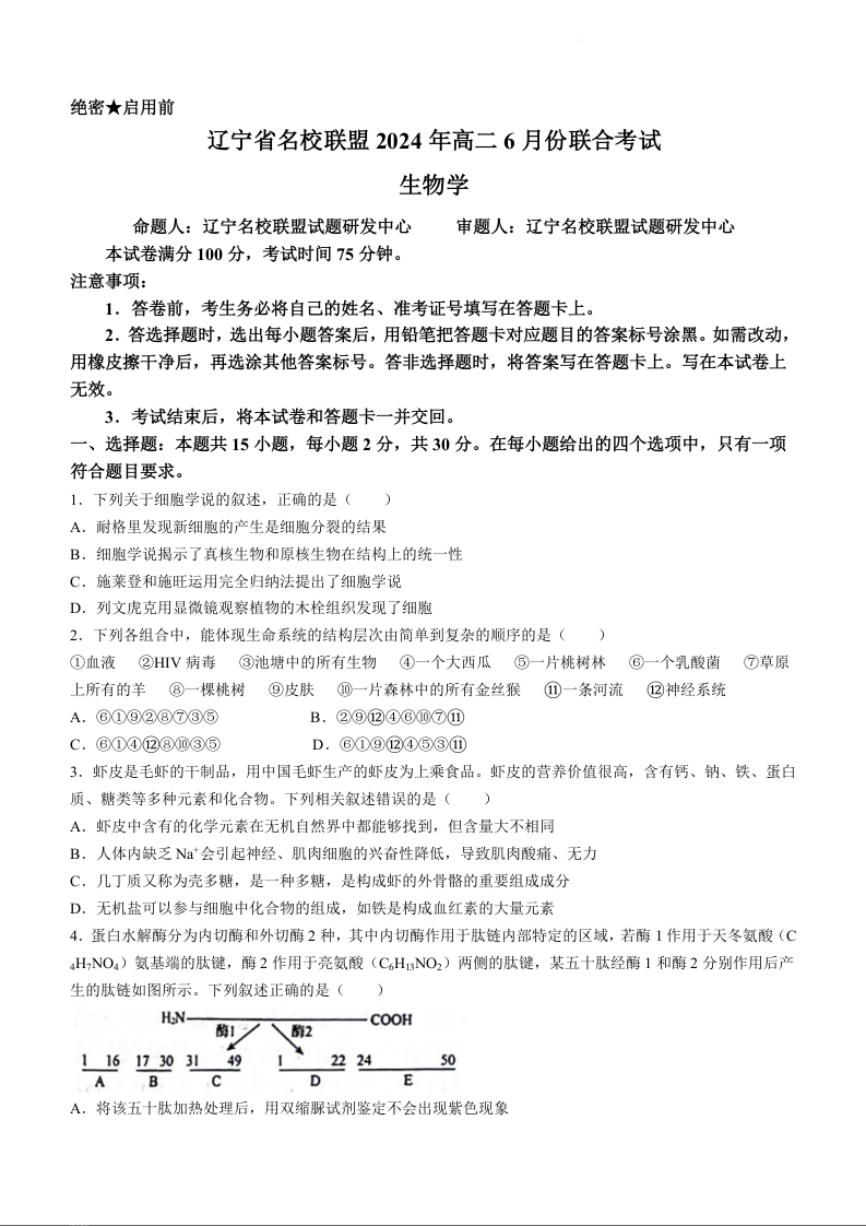 辽宁省名校联盟2023-2024学年高二下学期6月月考生物+答案