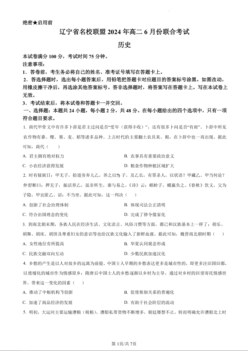 辽宁省名校联盟2023-2024学年高二下学期6月月考历史(原卷版)