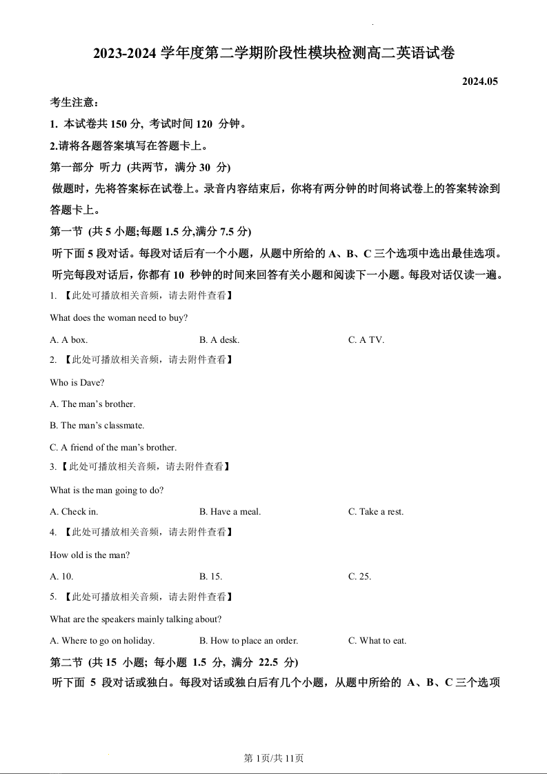 山东省淄博市临淄中学2023-2024学年高二下学期期中检测英语(原卷版)