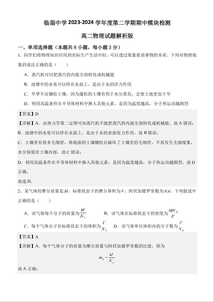 山东省淄博市临淄中学2023-2024学年高二下学期期中检测物理(解析版)
