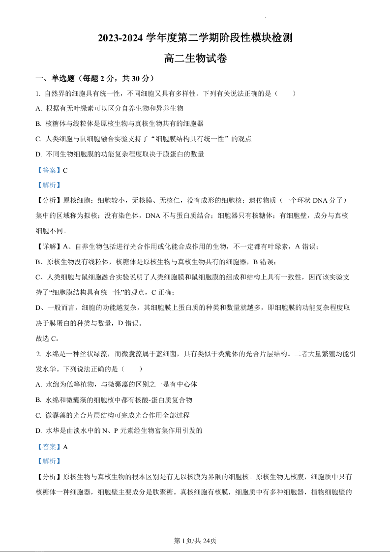 山东省淄博市临淄中学2023-2024学年高二下学期期中检测生物(精品解析版)