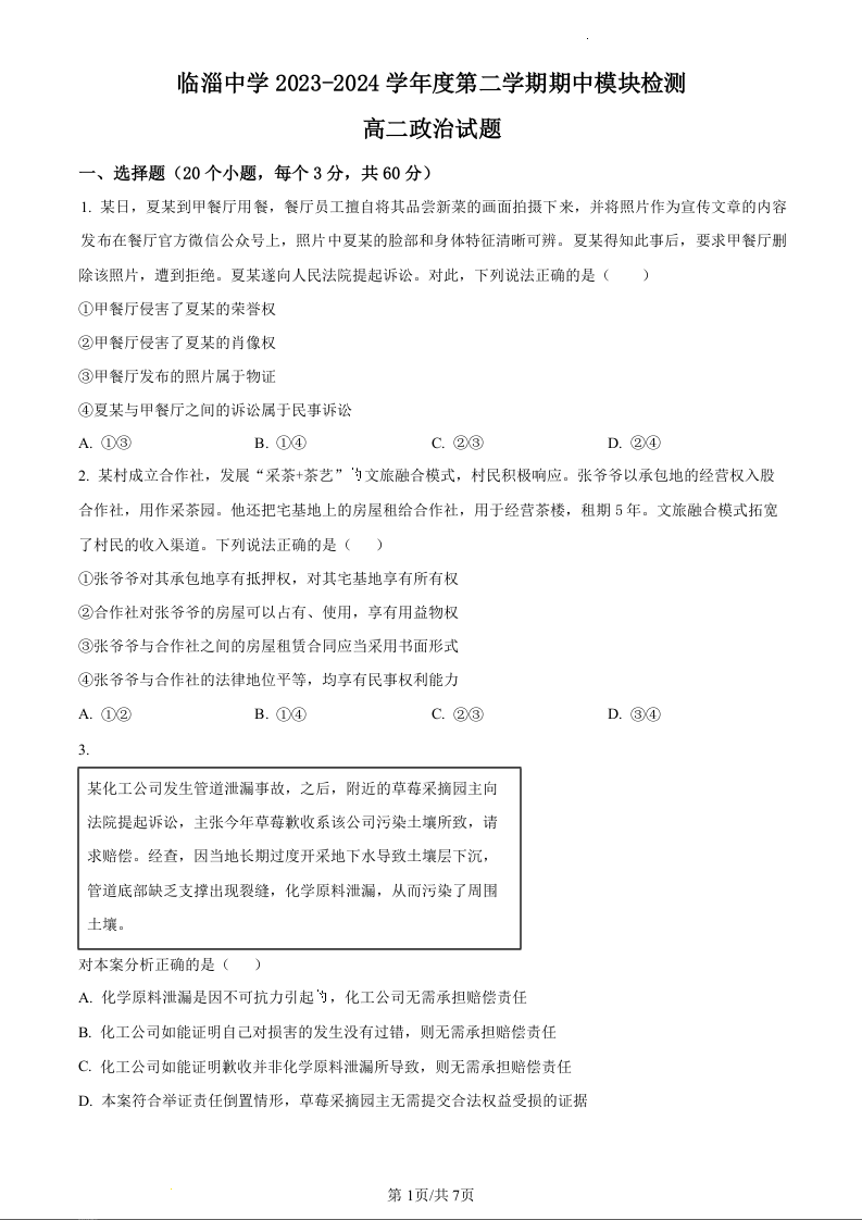 山东省淄博市临淄中学2023-2024学年高二下学期期中检测政治(原卷版)
