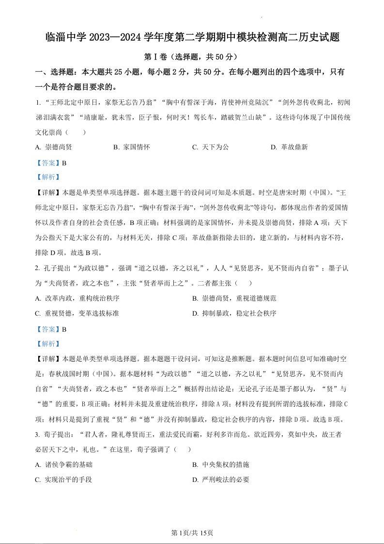 山东省淄博市临淄中学2023-2024学年高二下学期期中检测历史(精品解析版)