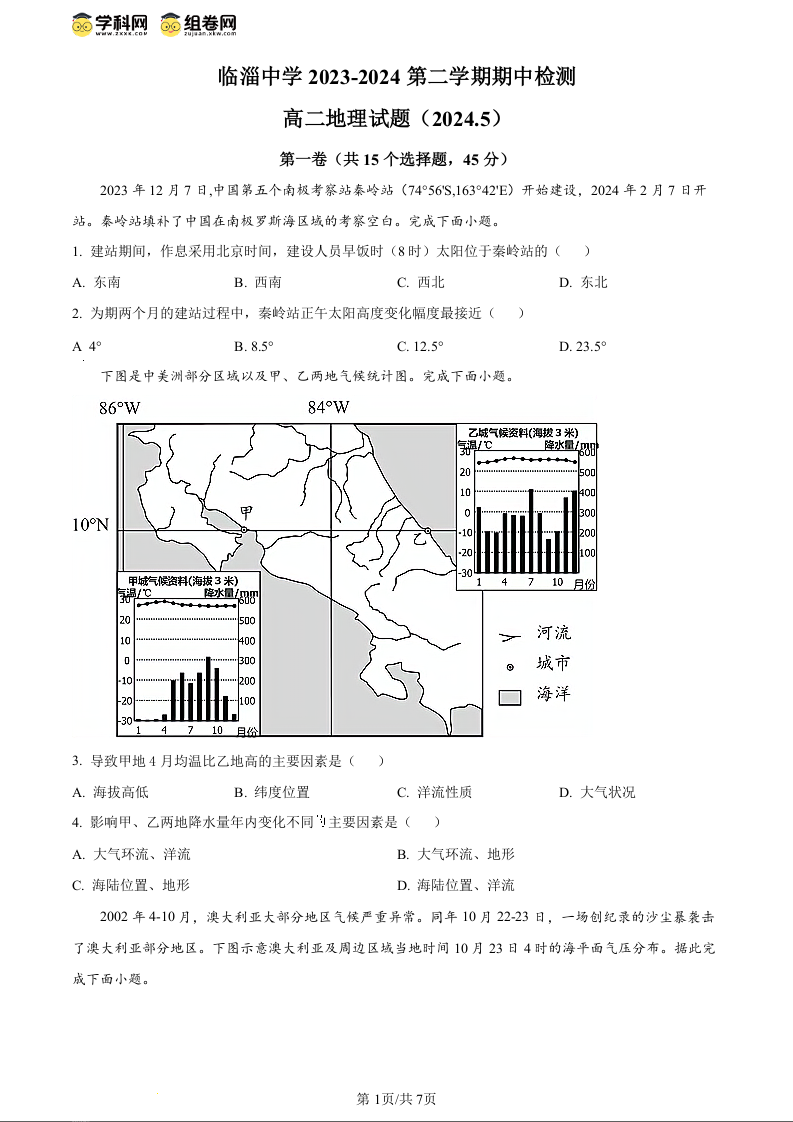 山东省淄博市临淄中学2023-2024学年高二下学期期中检测地理(原卷版)