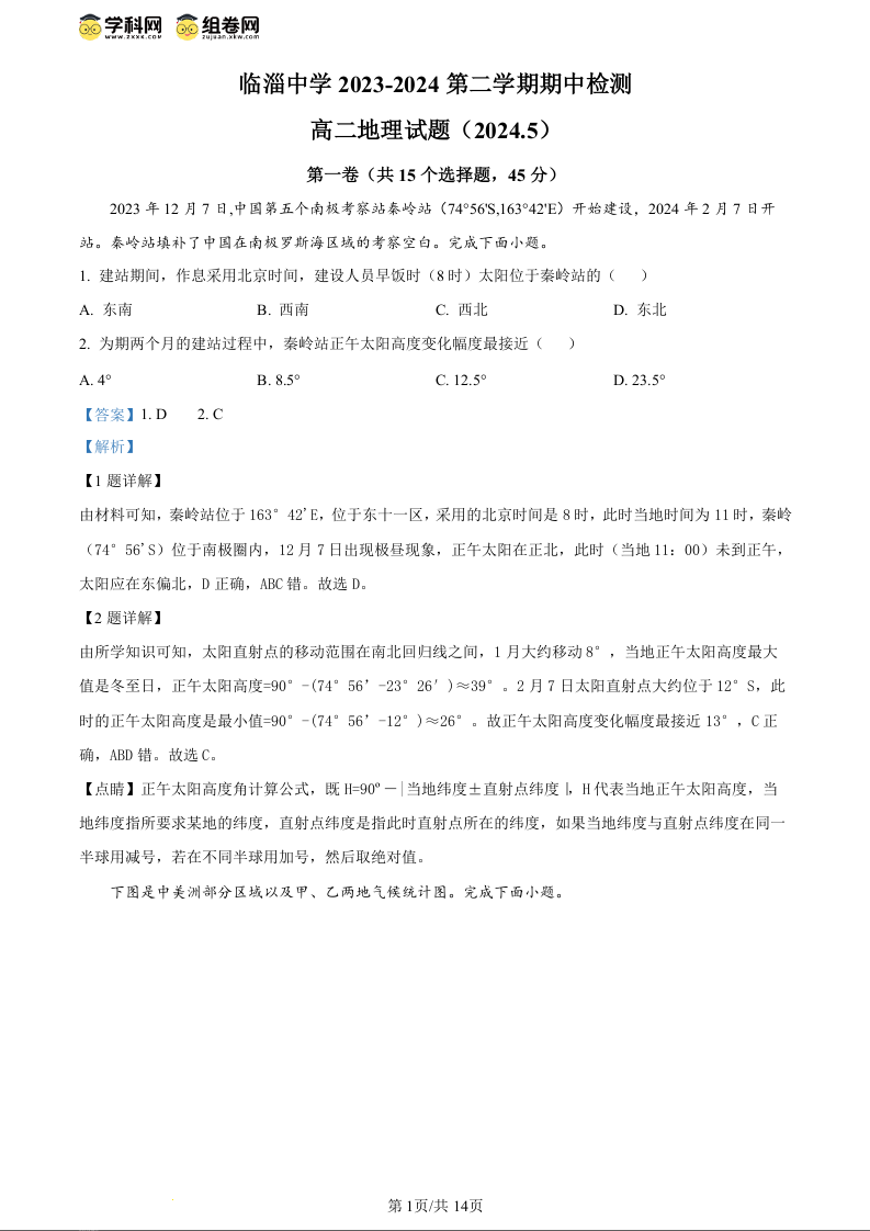山东省淄博市临淄中学2023-2024学年高二下学期期中检测地理(精品解析版)
