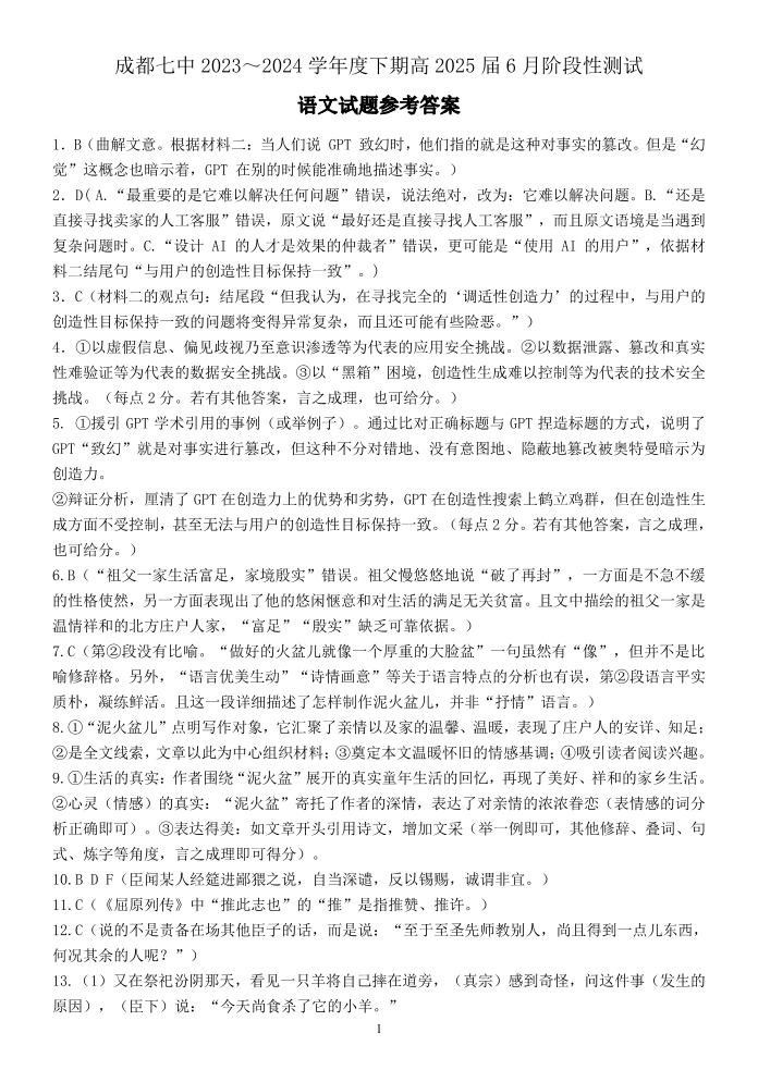 四川省成都市第七中学2023-2024学年高二下学期6月月考语文答案