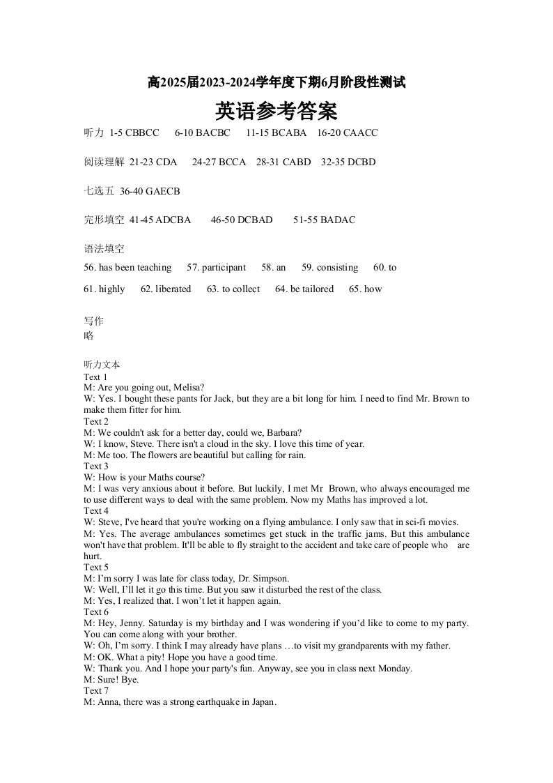 四川省成都市第七中学2023-2024学年高二下学期6月月考英语答案