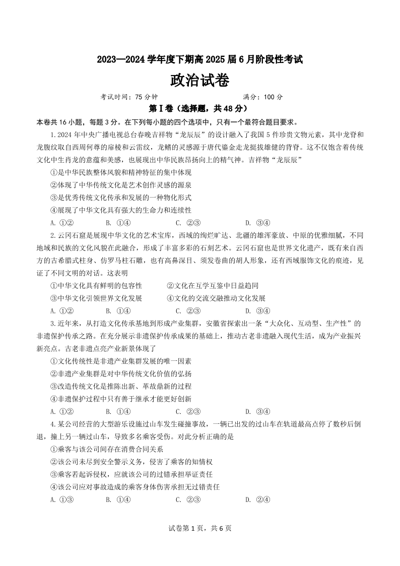 四川省成都市第七中学2023-2024学年高二下学期6月月考政治