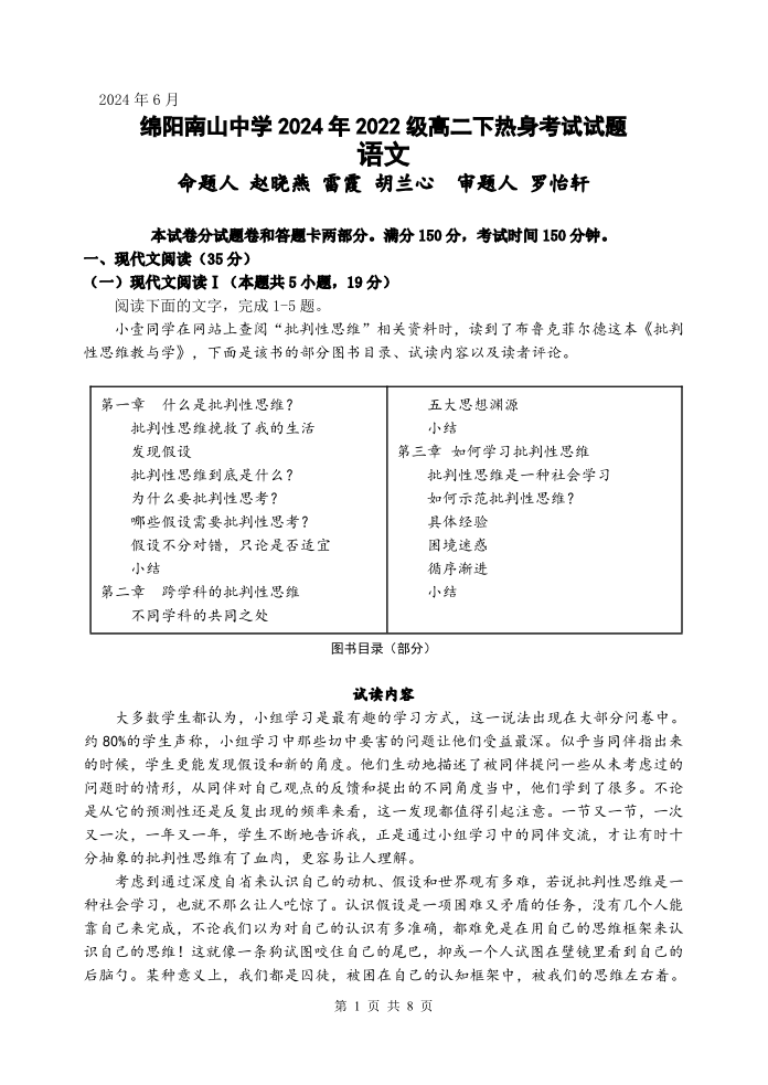 四川省绵阳市南山中学高2025届下学期期末考试语文