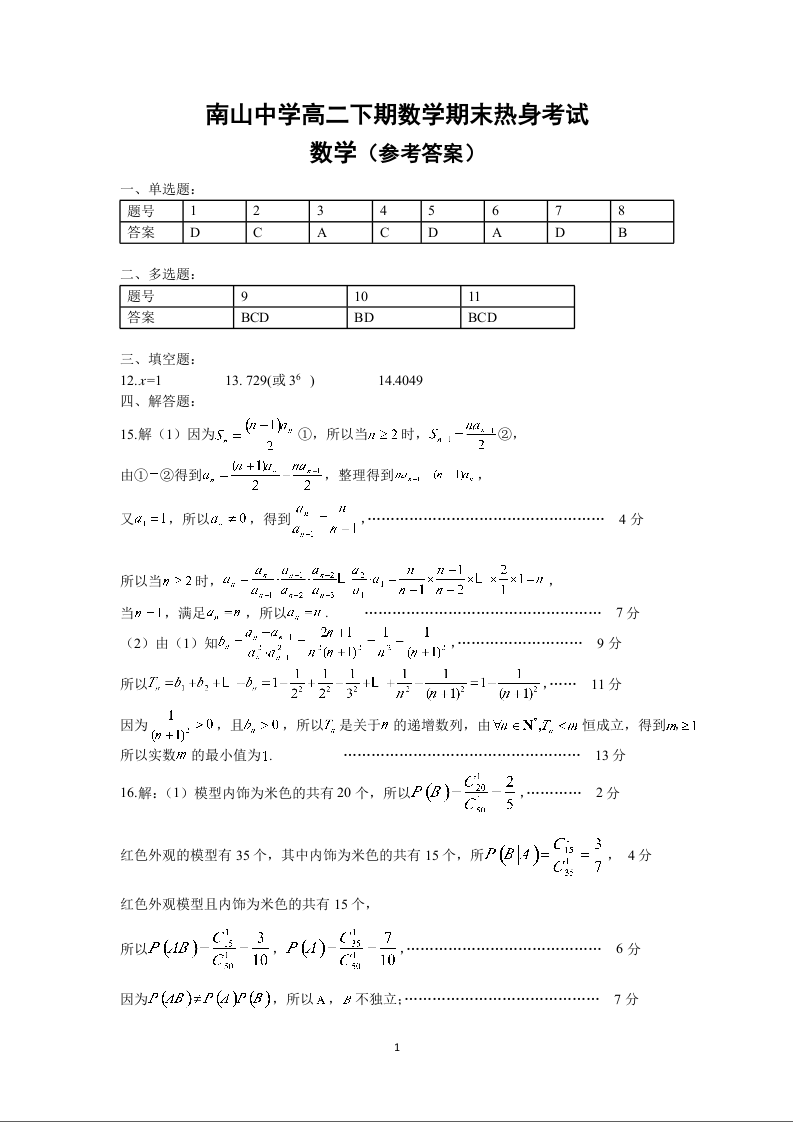 四川省绵阳市南山中学高2025届下学期期末考试数学答案