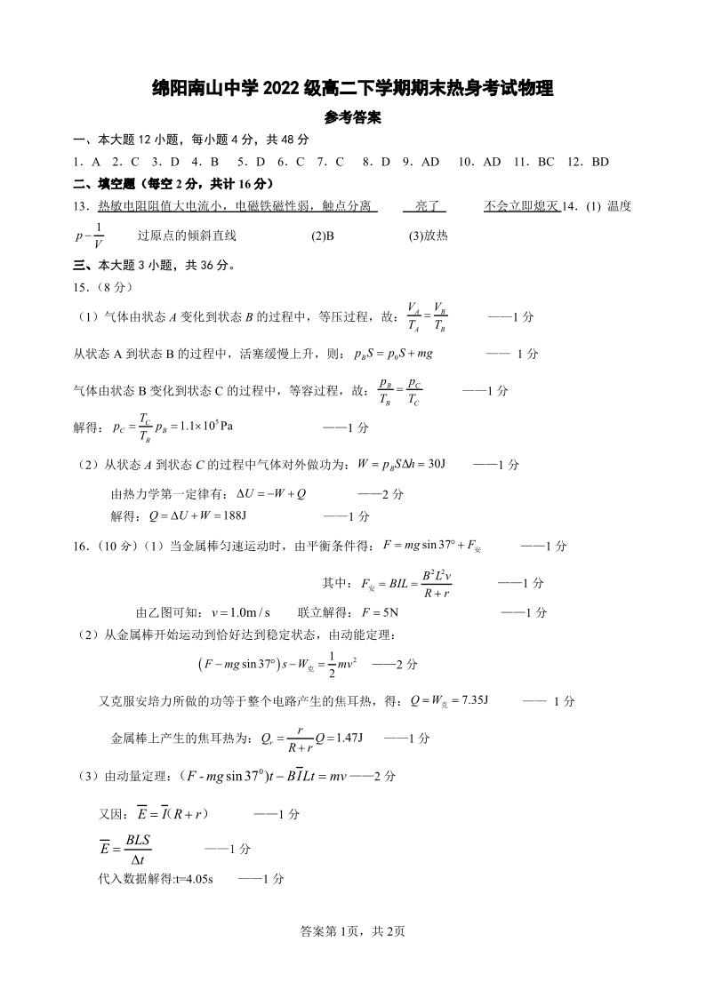 四川省绵阳市南山中学高2025届下学期期末考试物理答案