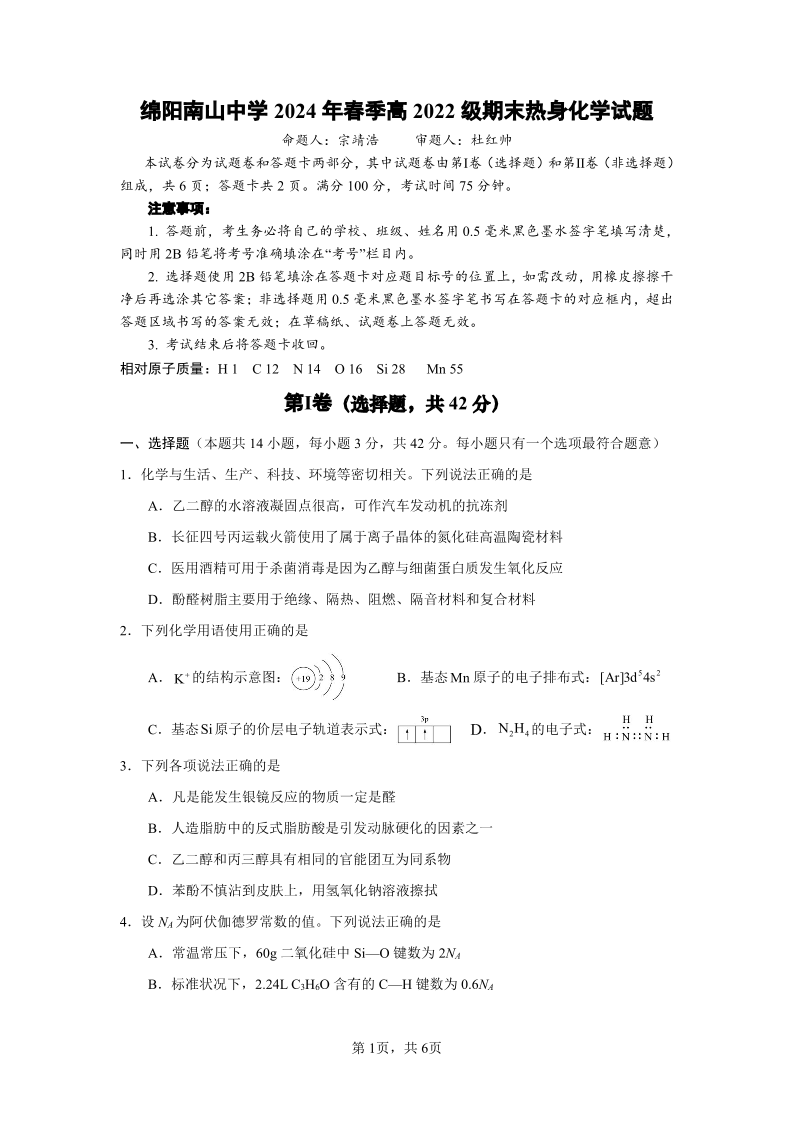 四川省绵阳市南山中学高2025届下学期期末考试化学