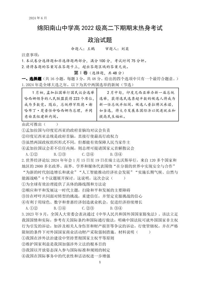 四川省绵阳市南山中学高2025届下学期期末考试政治