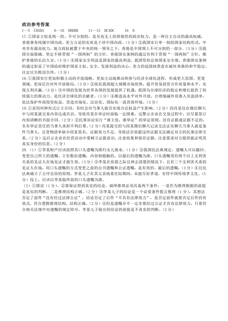 四川省绵阳市南山中学高2025届下学期期末考试政治答案