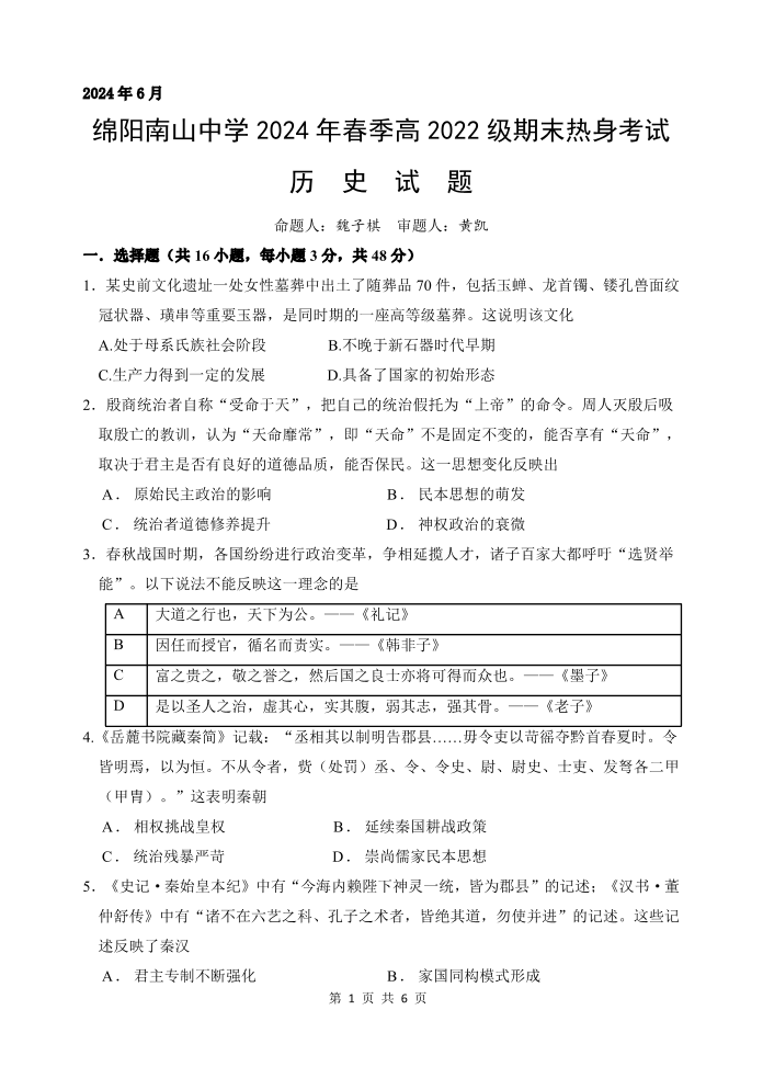四川省绵阳市南山中学高2025届下学期期末考试历史