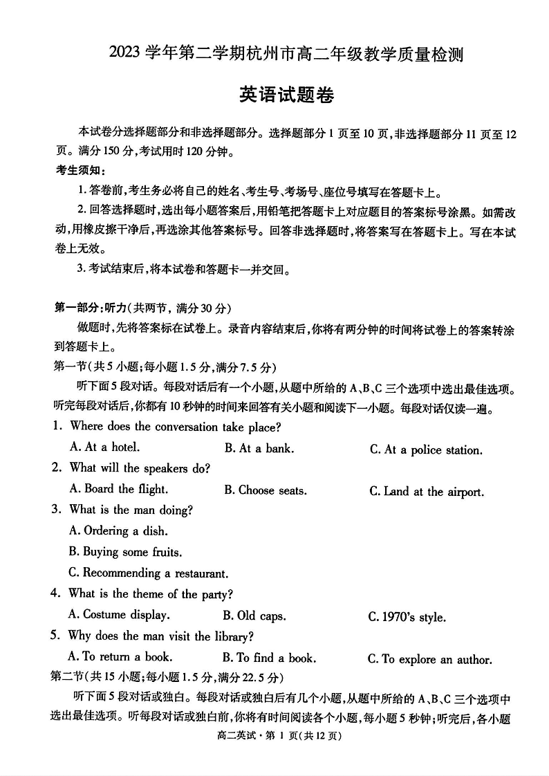 浙江省杭州市2025届高二下学期6月期末考试英语