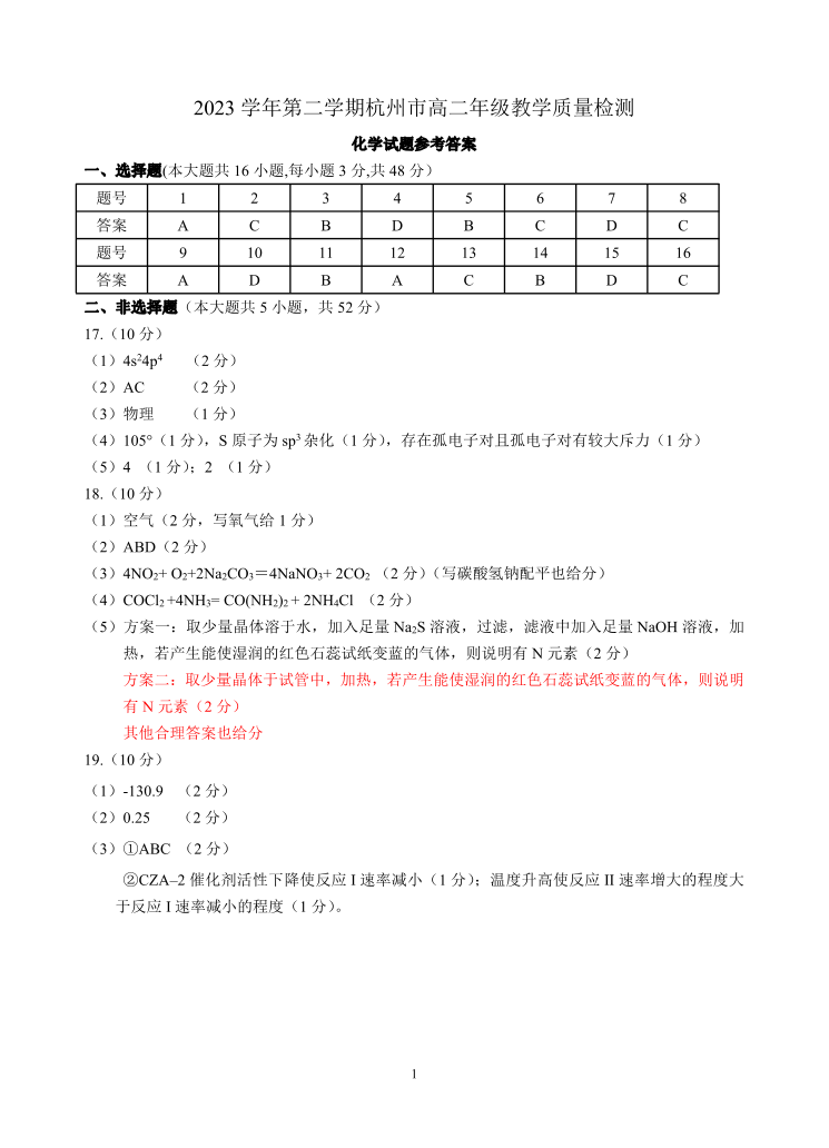 浙江省杭州市2025届高二下学期6月期末考试化学答案