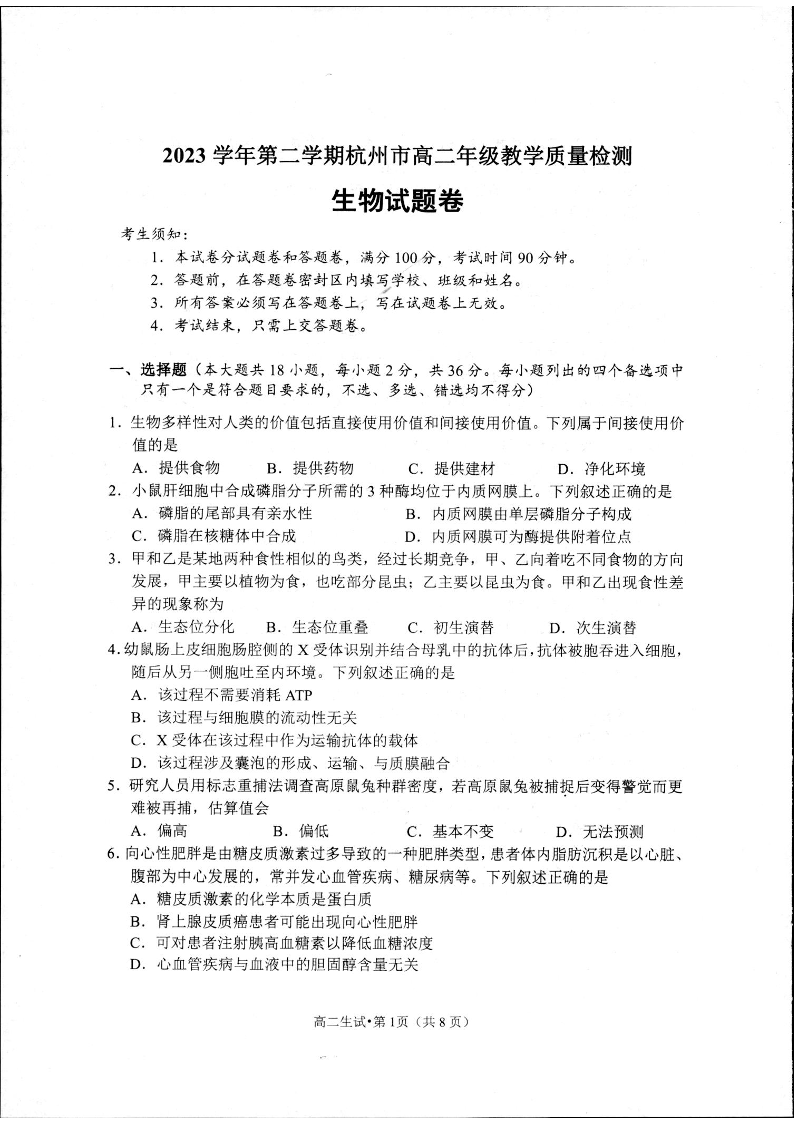 浙江省杭州市2025届高二下学期6月期末考试生物