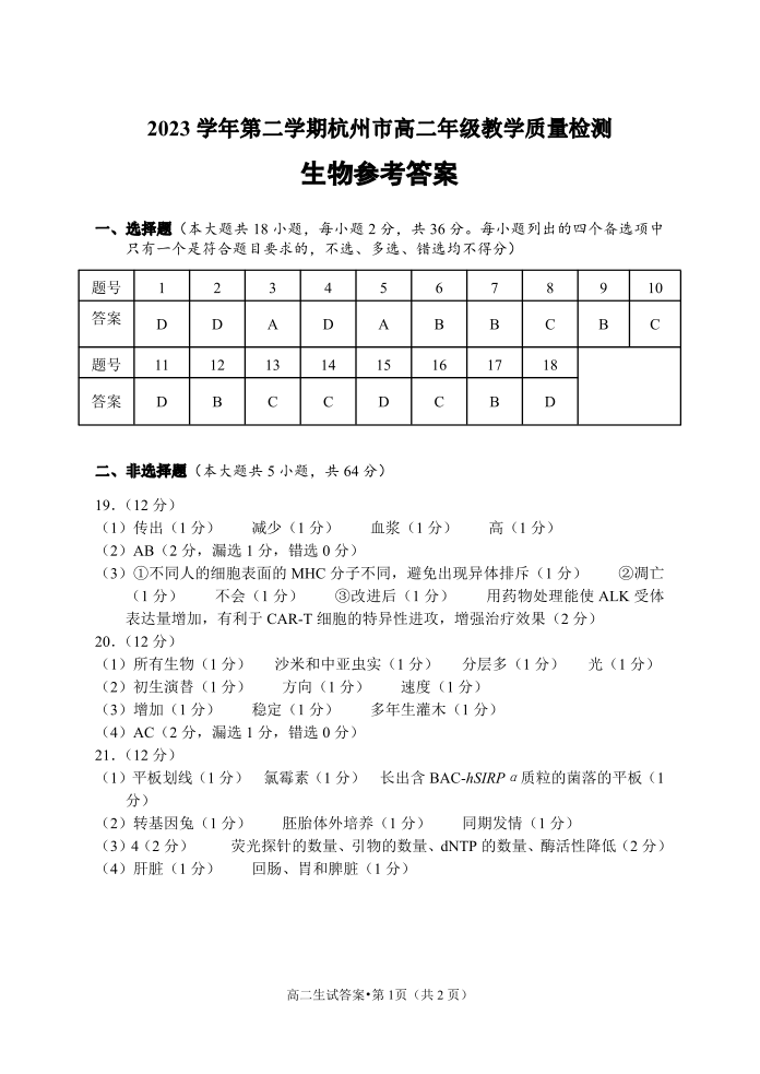 浙江省杭州市2025届高二下学期6月期末考试生物答案