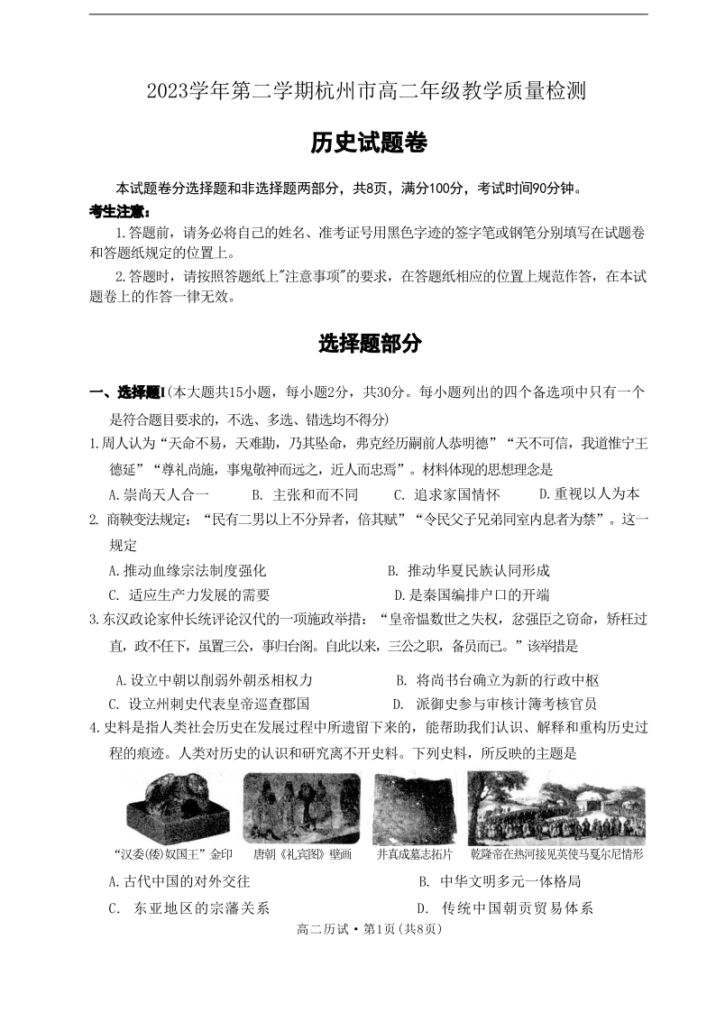 浙江省杭州市2025届高二下学期6月期末考试历史