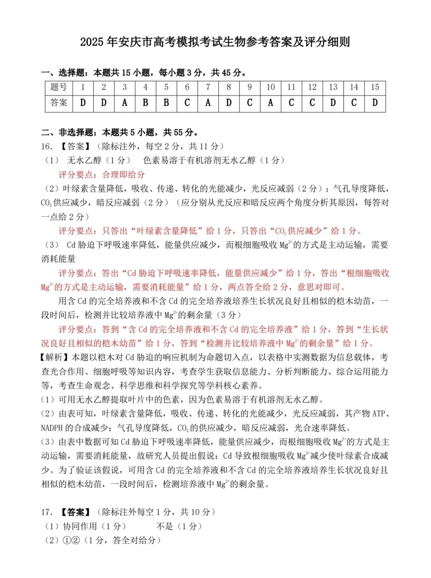 安徽省安庆市2025届高三第二次模拟(安庆二模)生物答案