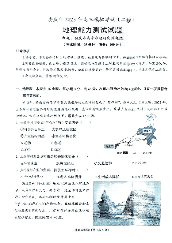 安徽省安庆市2025届高三第二次模拟(安庆二模)地理+答案